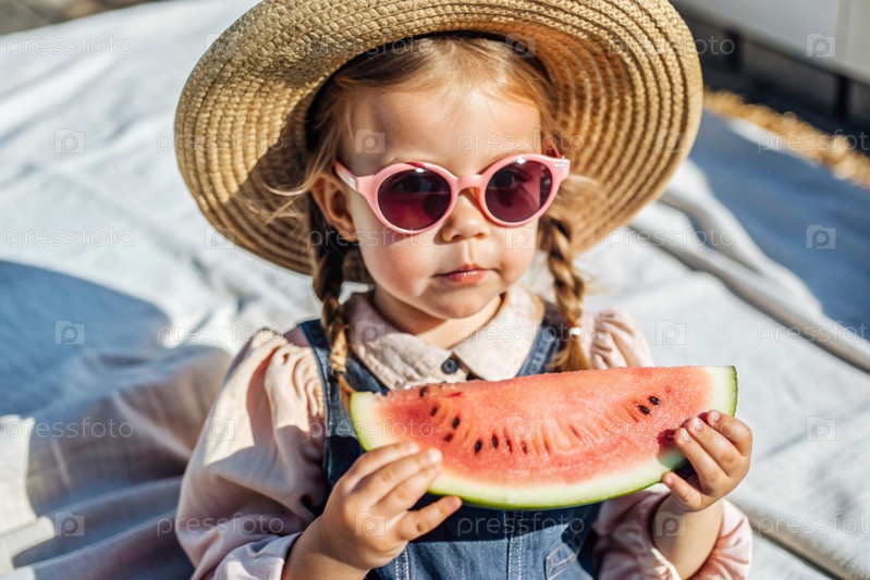 Маленькая девочка в солнцезащитных очках ест арбуз в жаркое лето. забавный счастливый ребенок с арбузом в руках. ребёнок смотрит на камеру, здоровая пища