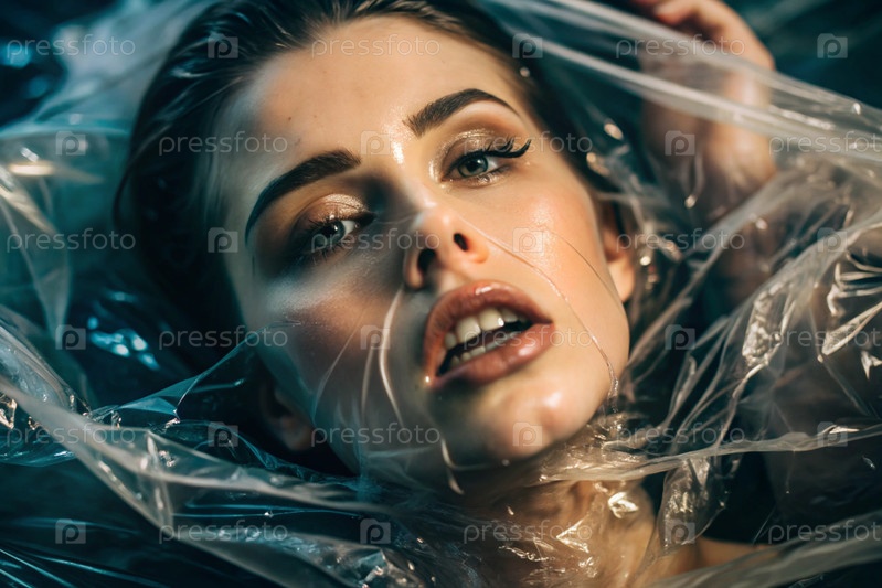 Девочка завернута в целлофан или сумку. Девушка задыхается. Пластиковое загрязнение планеты. Опасность для окружающей среды. Сокращение повторного использования пластика. Переработка. Концепция мусора