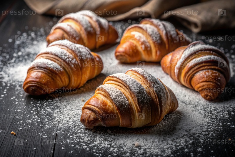 Вкусные свежевыпеченные кроассанты на тёмном фоне сланца. французский завтрак. хорошие ближневые выпечки. пекарня со вкусным хлебом. кондитерские изделия