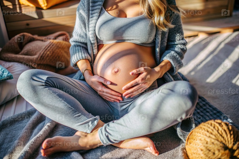Молодая беременная женщина держит свой живот на фоне интерьера дома. Близко. Женщина готовится стать матерью. Беременность и роды