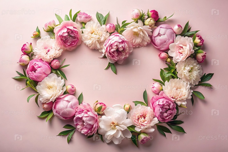 Каркас в форме сердца с красивыми цветками пионки на пастельно-розовом фоне.Плоская планировка, вид сверху, место для копирования, летние цветы