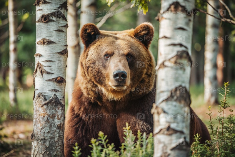 Большой коричневый медведь против березовой рощи.Охота на животных.Браконьерство