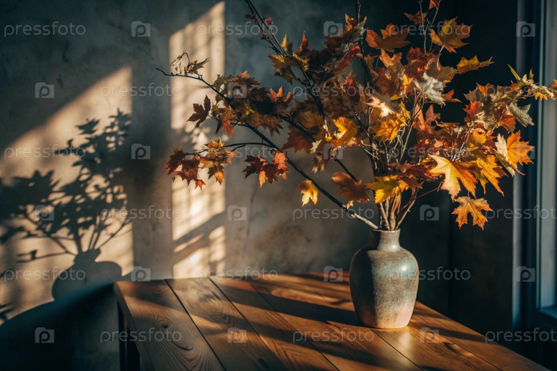 Ветви с золотыми осенними листьями в керамической вазе на деревянном столе у окна. Концепция домашнего комфорта. Осенний декор для Хэллоуина