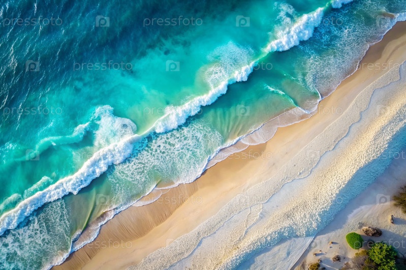 Концепция отдыха и путешествий. Красивый фон. Вид сверху на белый песчаный пляж и пенообразная волна бирюзового океана