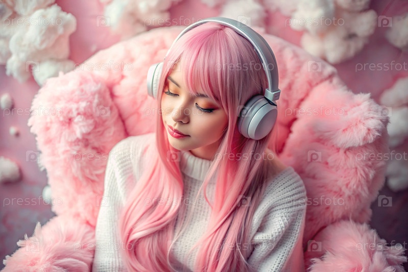 Молодая красивая японская девушка с розовыми волосами в аниме слушает музыку на беспроводных наушниках в розовых облаках