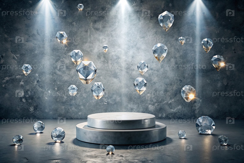 Минималистский фон для выставки ювелирных изделий. Современный пустой подиум с серой стеной и бриллиантами. Креативный дизайн презентации продукта
