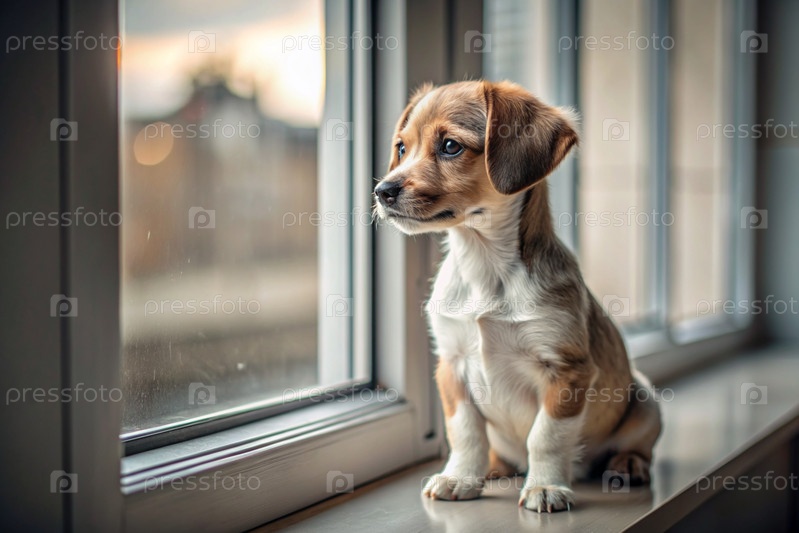 Маленький щеночек смотрит в окно и ждет своего хозяина