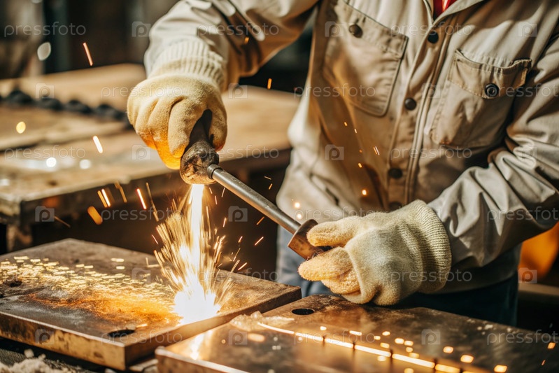 Работа на фабрике. Трудовые профессии. Мужские руки в металлических защитных перчатках. Вокруг искры. Тяжелая работа, требующая высокой концентрации и профессионализма