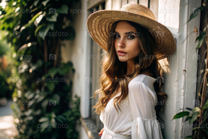 Красивая девушка в белом светлом платье и соломенной шляпе на улице летнего города.Она смотрит в камеру.Летние каникулы