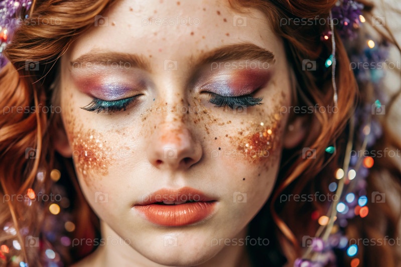Покрытие лица девушки праздничным макияжем и ленточками.Изображение придает ей сказочный и мистический вид.Концепция новогодней ночи или дня рождения