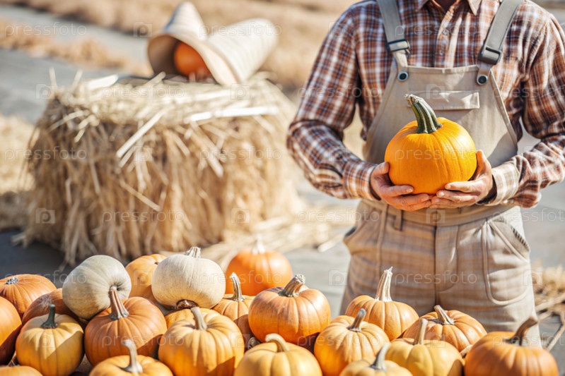 Руки мужчины в квадратной рубашке с тыквенным крупным планом и красивым осенним рисунком. Сбор тыков. Концепция празднования Дня благодарения и Хэллоуина