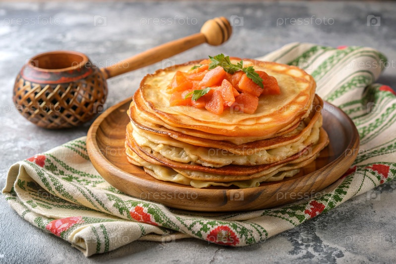 Вкусные блины с соленой красной рыбой.Концепция российского праздника Масленицы
