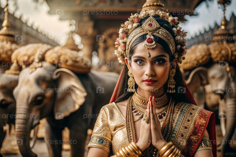 Красивая индийская девушка в традиционном национальном костюме, сари. со слонами. портрет символизирует традиции, культуру и красоту народа Индии