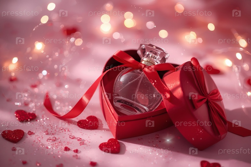 Элегантная бутылка женского парфюма в мягкой розовой подарочной коробке, украшенной красной лентой и сердцами