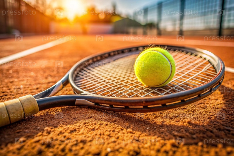 На грунтовом корте есть желтый теннисный мяч и теннисная ракетка. летний вид спорта. отличный теннис