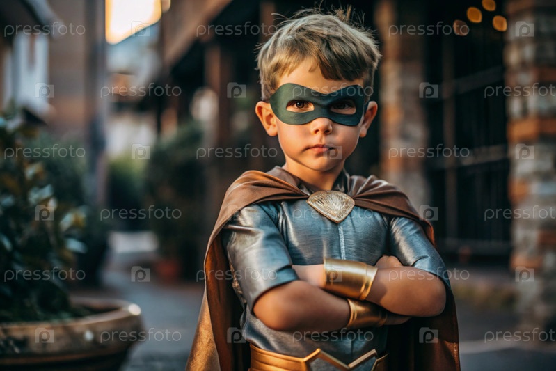 Маленький мальчик в костюме супергероя на улице ребенок со сверхспособностями герой костюмированная вечеринка