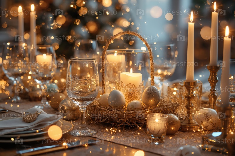 Пасхальный баннер 2026. декоративная тарелка, столовая посуда, стаканы, пасхальные яйца и кролики. концепция празднования Пасхи для кафе и ресторанов