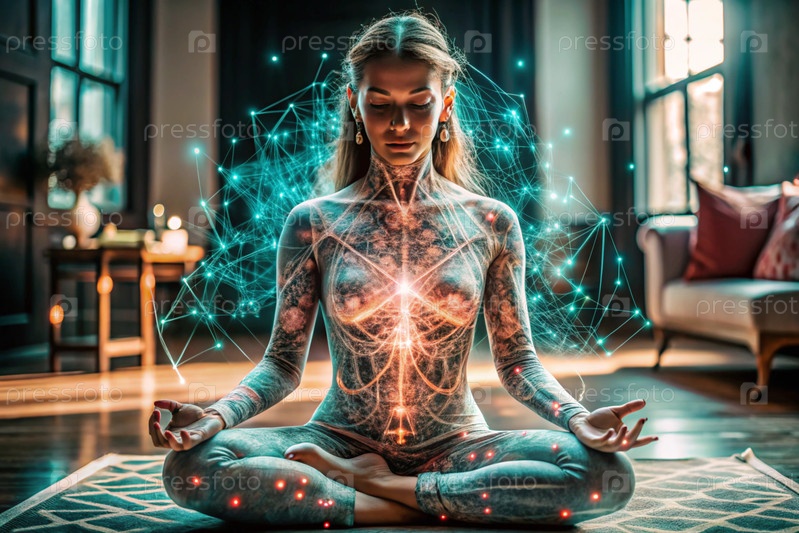 Концепция эзотерической духовной медитации, женщина в позе лотоса.Человеческая медитация, духовность и активация чакр, мистический дух