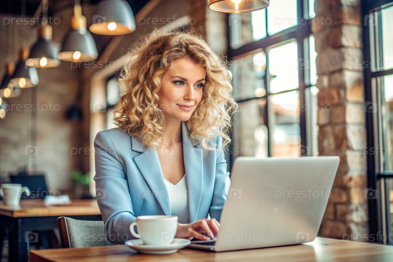 Молодая бизнес-женщина работает на ноутбуке в кафе или делает покупки онлайн
