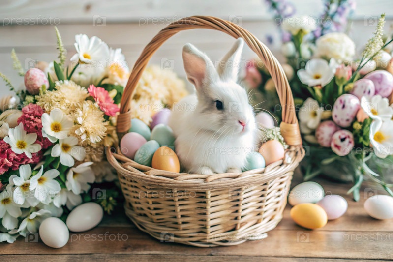 Баннер. пасхальный кролик в плетеновой корзине, наполненной красочными пасхальными яйцами. концепция весенних праздников Пасхи