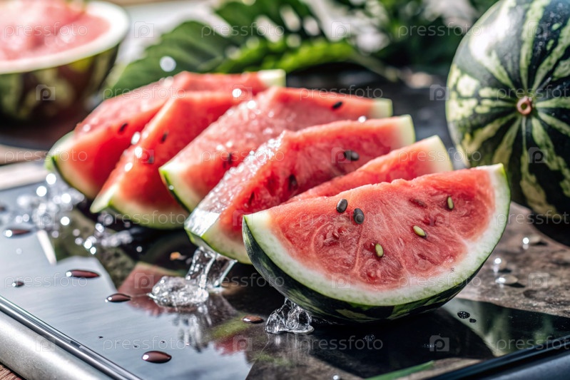 Закрытие свежих ягод арбуза. Вкусные ягоды и фрукты ярко-красного цвета с капельками воды. Вегетарианство. Здоровое питание. Свежие плоды на столе