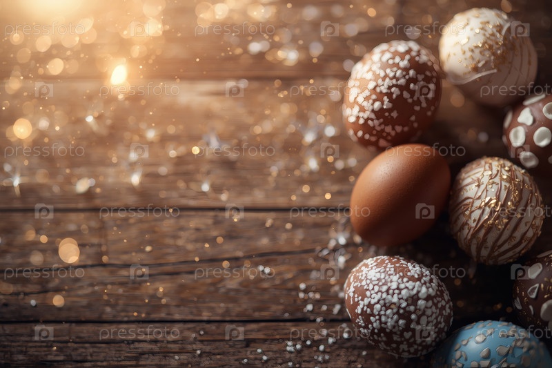 Концепция ярких пасхальных праздников в 2026 году. Хорошая открытка. Баннер. Шоколадные пасхальные яйца на деревянном фоне. Пасхальные сладости и лакомства