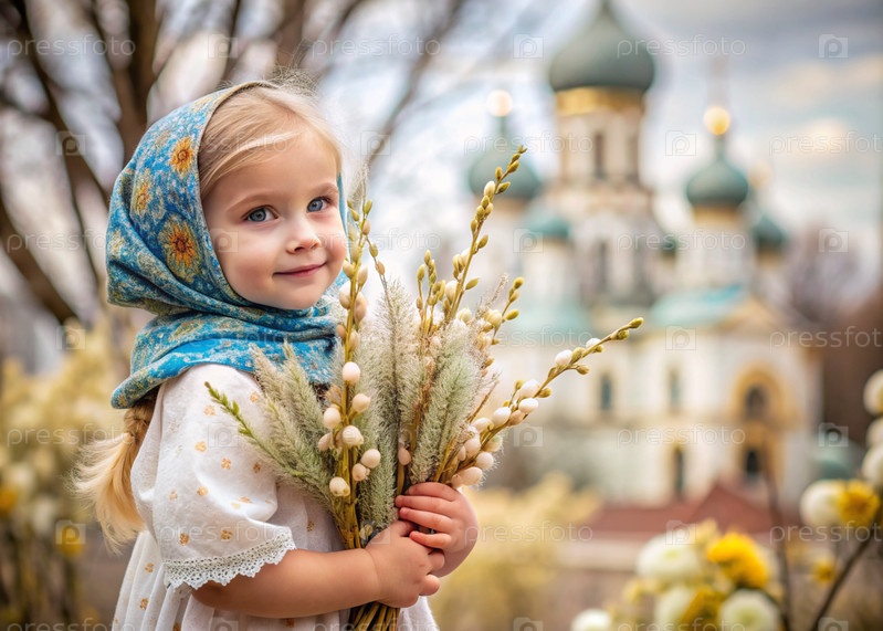 Неделя пальмовых деревьев. христианство. портрет трехлетней девочки в русском народном шале с ветвями ивы в руках на фоне церкви и заката