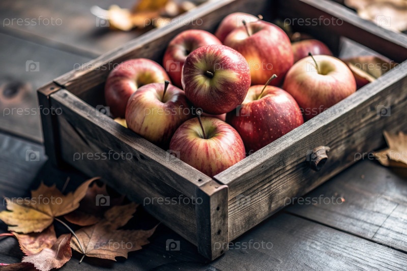 Деревянная коробка, наполненная свежими фруктами. Корзина с красными яблоками. Красивое солнечное сияние. Осенний урожай