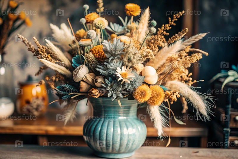 Красивый букет сушеных цветов в керамической вазе на древнем деревянном шкафу. Букет цветов в вазе во внутренней части дома. Светлый, бежевый, синий цветочный фон