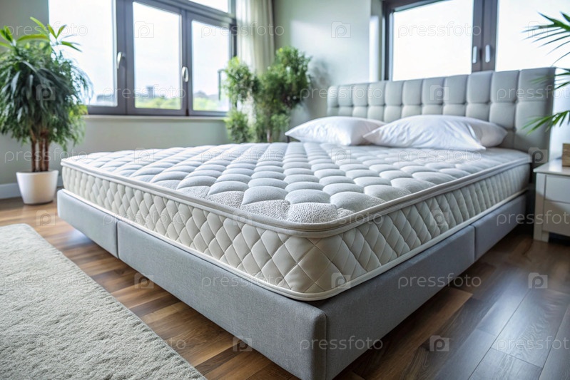 Новый белый роскошный комфортабельный ортопедический матрас на кровати в светлой спальне