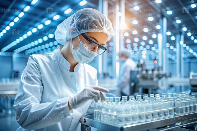 Производство лекарств: фармацевт тестирует медицинские флаконы на автоматическом трубопроводе фармацевтической производственной линии с использованием искусственного интеллекта