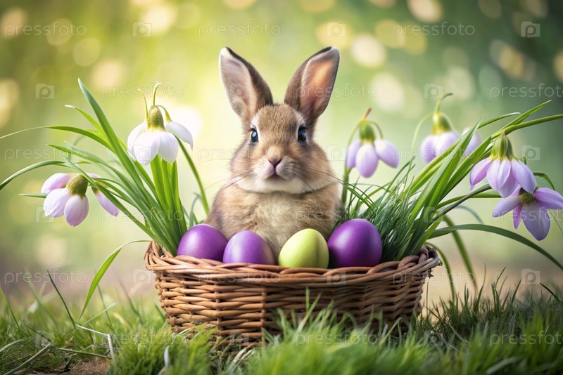 Баннер. пасхальный кролик в корзине из красочных пасхальных яиц вокруг весенних снегопадов и первичной розы. концепция праздника Пасхи