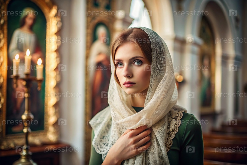 Портрет красивой молодой женщины с платками в православной церкви.Девушка молится в церкви среди икон