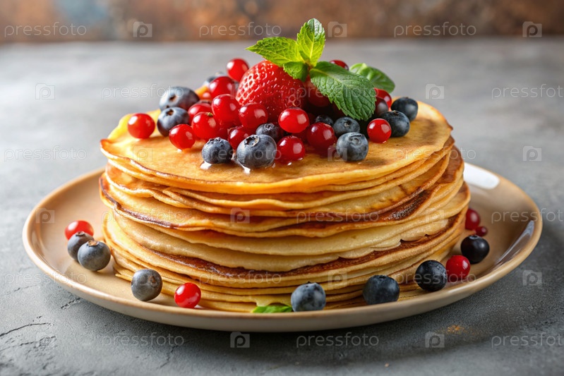 Вкусные блины с медом, ягодами, чернилами, клюквами и малиной.Концепция российского праздника Масленица
