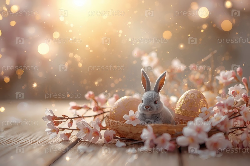 Концепция яркого пасхального праздника. Нежные розовые пасхальные яйца, кролики и вишневые ветви на деревянном фоне. Концепция ярких пасхальных праздников в 2026 году