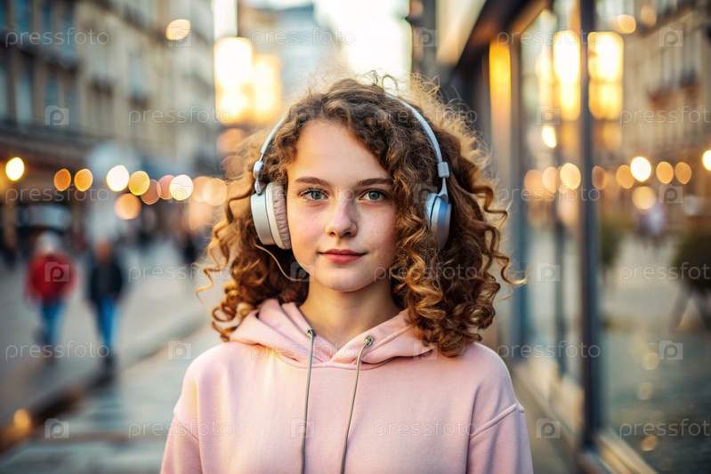 Молодая красивая кудрявая женщина слушает музыку с наушниками на вечерней улице города при закате солнца.Мир, гармония, отдых и расслабление