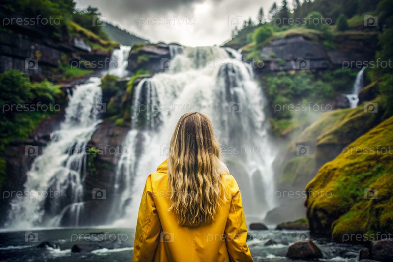 Женщина в резиновом плаще среди огромного голубого водопада. она путешествует и наслаждается жизнью и окружающей средой. туризм