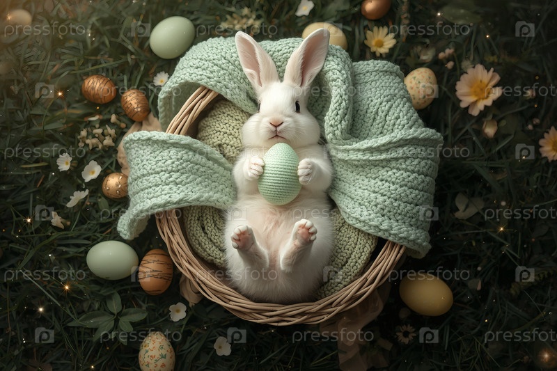 Пасхальный кролик пасхальное яйцо в лапах, лежащее на спине на сером вязанном одеяле в корзине из колючки и уставившееся в камеру