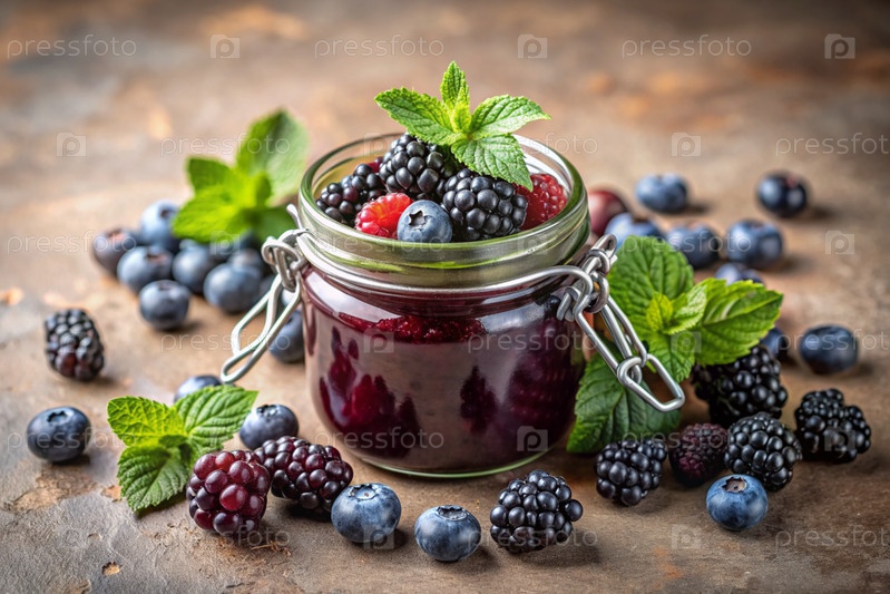 Банка домашней черники, здоровый варенье с мятой на чёрном фоне.Сохранение и уборка летом