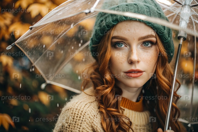 Осенний портрет под дождем. Близкий план молодой рыжеволосой женщины с ярко выраженными зелеными глазами в вязанной шляпе под зонтиком