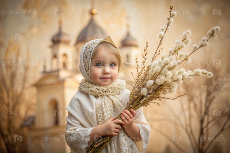 Пальмовое воскресенье. христианство. портрет трехлетней девочки в русском народном шале с ветвями ивы в руках на фоне православной церкви