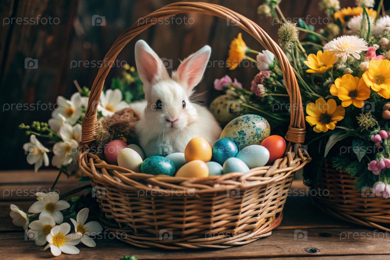 Баннер. пасхальный кролик в плетеновой корзине, наполненной красочными пасхальными яйцами. концепция весенних праздников Пасхи