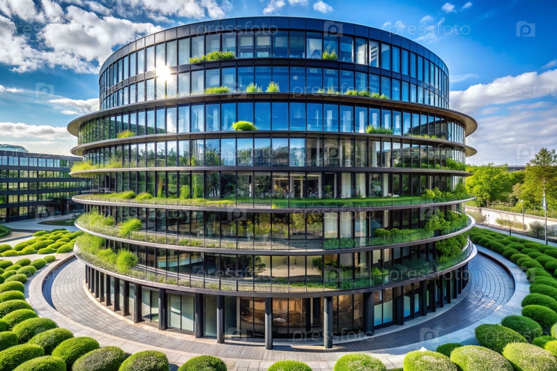 Современная городская экология. Снижение выбросов углекислого газа в городе. Экологически чистое стильное здание с посаженными зелеными растениями для нормализации содержания кислорода в воздухе
