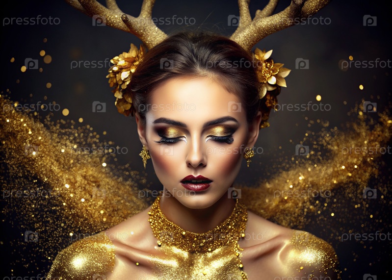 Творческий баннер для салона красоты в черно-золотых тонах. Профессиональный макияжный художник, стилист и парикмахер. Красивая женщина с вечерним гримом и золотыми рогами на голове. Индустрия красоты