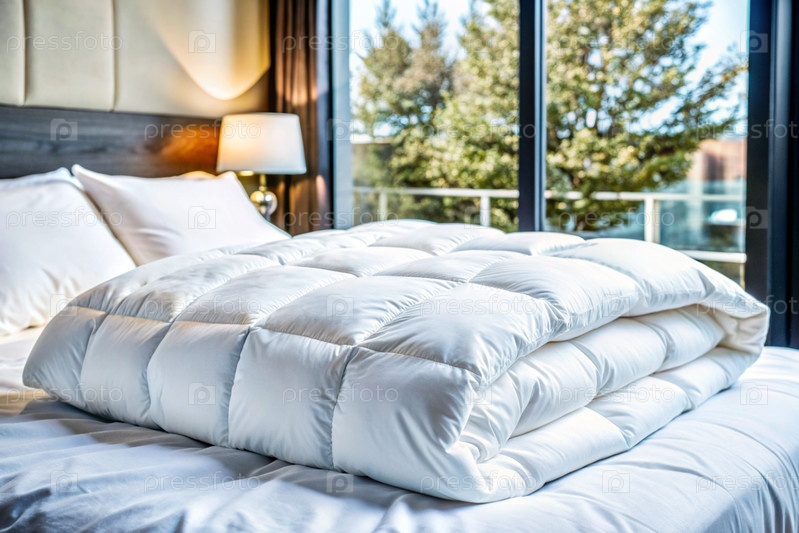 Подготовка к холодному зимнему сезону, уборка дома, гостиничный или домашний текстиль.Белое сложенное одеяло лежит на постели для макияжа