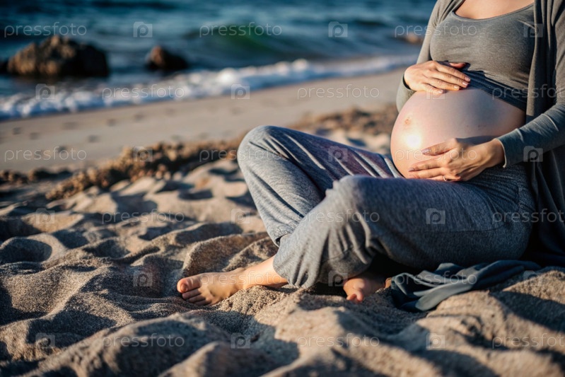 Расслабление, спокойствие, морской воздух. Закрытие живота. Беременная женщина на пляже у моря. Концепция беременности, родов и родительских обязанностей