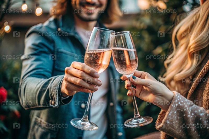 Стаканы розового игристого вина в руках влюбленной пары. Люди на романтическом свидании. Понятие любви