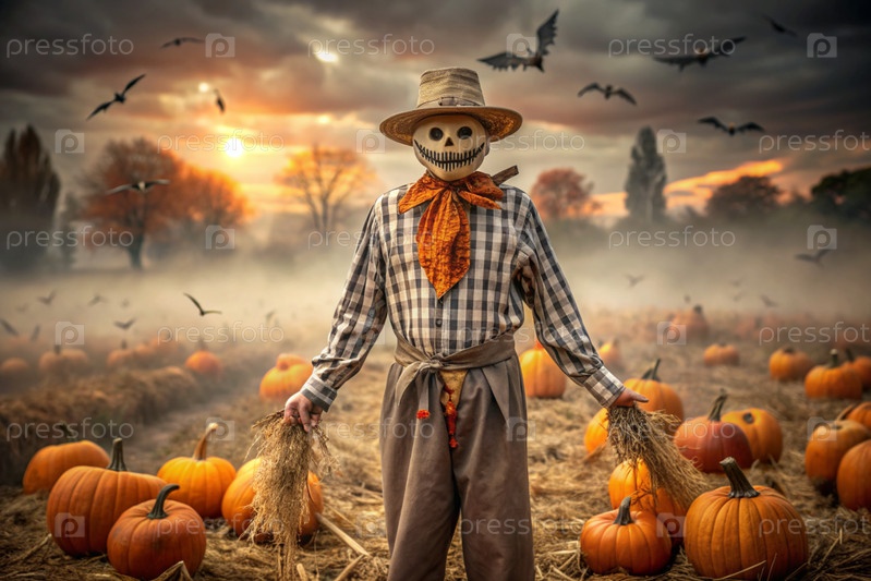 Концепция Хэллоуина. Ужасная. Страх. Устрашающий богий с тыквенной головой, квадратной рубашкой и бабочкой. Баннер, открытка