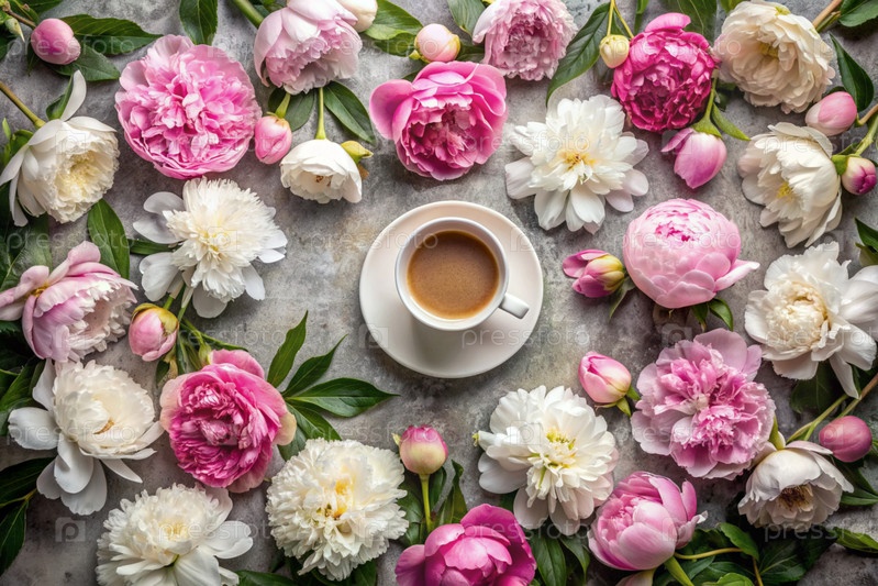 открытка. чашка кофе с тарелкой и белые розовые пионы. красивая натюрмортная картина. весна, лето. приятное утро концепция