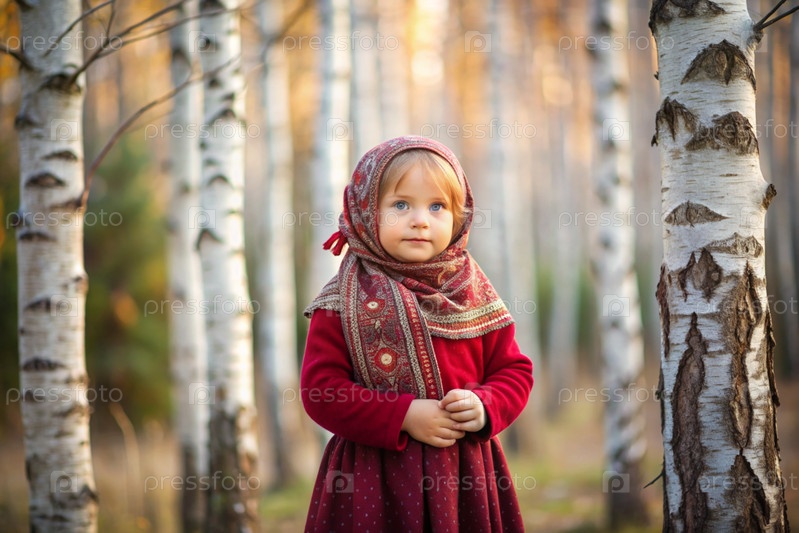 Русские народные традиции.Русский аромат.Красивая девочка в национальном русском платье и шарфе в красивом березовом роще.Портрет прекрасной девушки в березном лесу